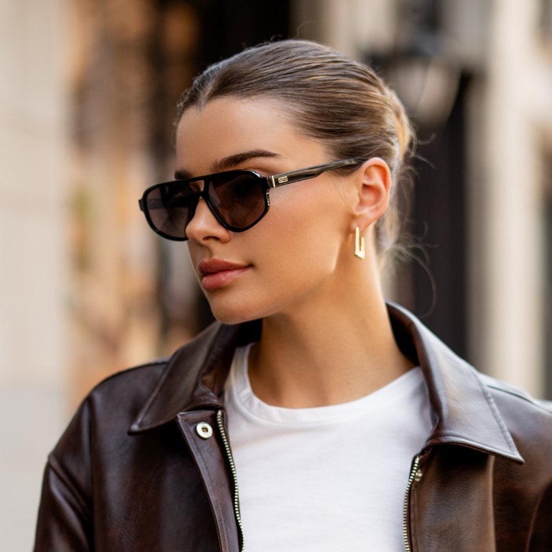 Brooklyn’s oversized shape, slight teardrop design, and bold double bar nod to 1980s aviator styles, while sharp geometric lines on an acetate frame and gold metal accents are all modern luxury.