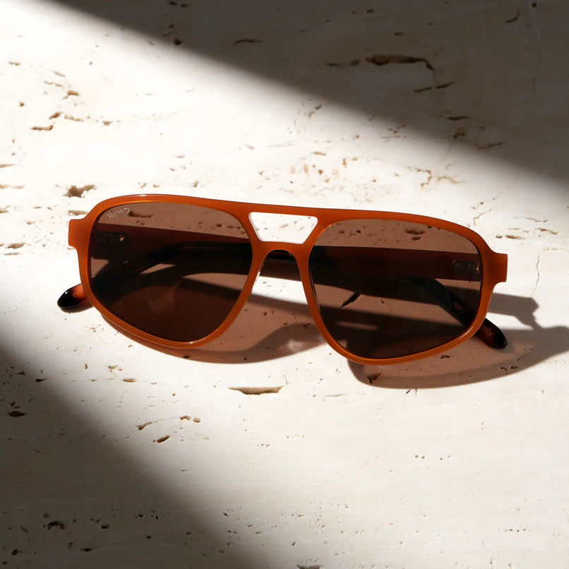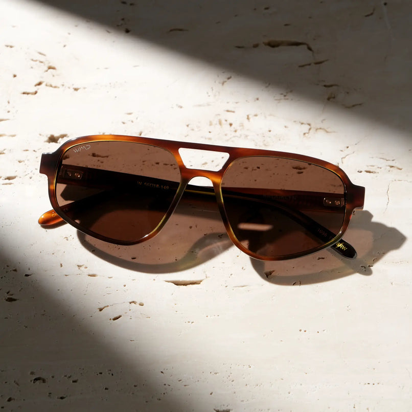 Brooklyn draws from classic aviator design with its double bridge and subtle teardrop rims. An oversized angular acetate frame, tapered arms, and gold detailing elevate the iconic look.