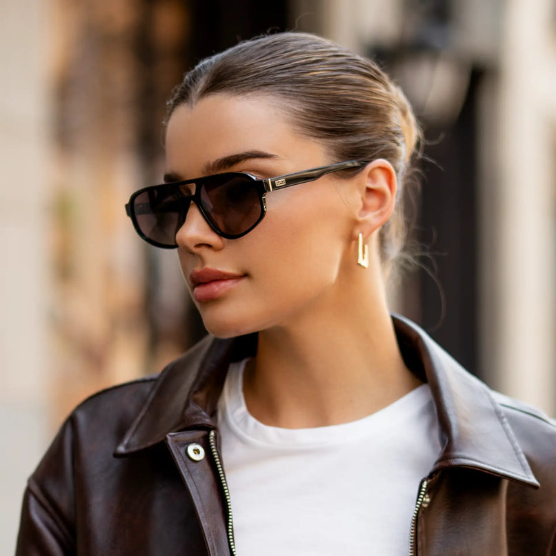 Brooklyn’s oversized shape, slight teardrop design, and bold double bar nod to 1980s aviator styles, while sharp geometric lines on an acetate frame and gold metal accents are all modern luxury.