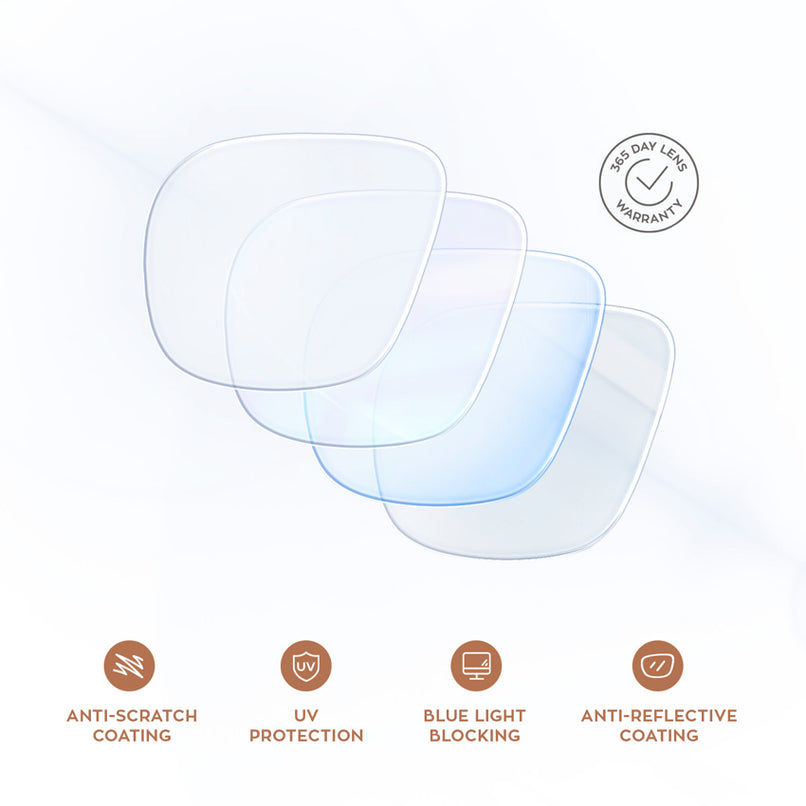 Enjoy sharp, comfortable vision with our clear prescription lenses, designed for everyday protection. Featuring anti-glare, scratch-resistant coatings, and built-in blue light blocking with 100% UV protection, these lenses keep your eyes safe and your vision clear all day long.
