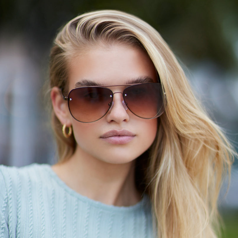 Bring the heat in Jade, a fierce and fiery frame guaranteed to garner double-takes. An attractively oversized aviator shape with a gradient lens and rimless effect. Make it a monochromatic moment in burgundy, black & brown or go glam with the blue mirrored lens, gold frame combo.