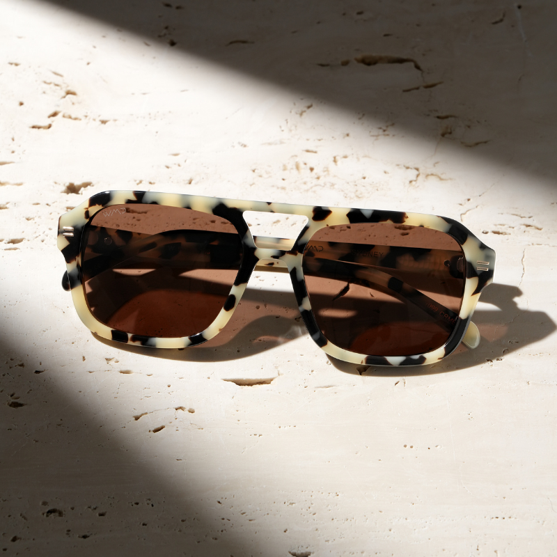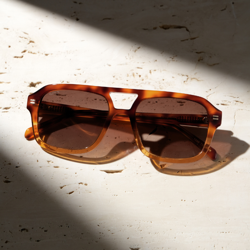 Inspired by 1970s aviators, Sydney’s extra-oversized square shape and double bridge are pure iconic style. The thick frame, unique color combos, and gold rivets only add to the cool factor.