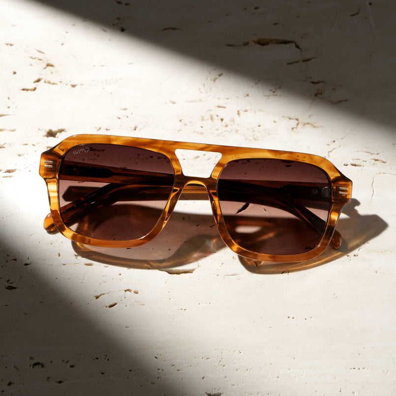 Sydney’s bold square shape, oversized design, and standout double bar deliver retro aviator vibes, while the chunky acetate frame and gold accents give a sense of understated luxury.