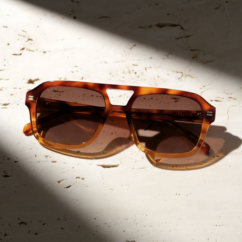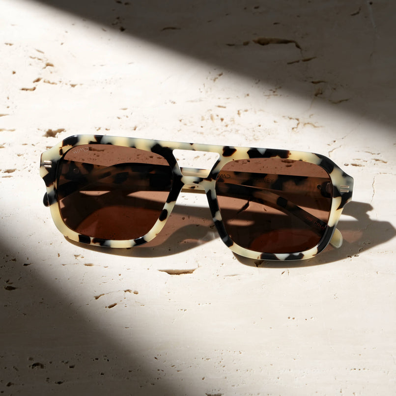 Inspired by 1970s aviators, Sydney’s extra-oversized square shape and double bridge are pure iconic style. The thick frame, unique color combos, and gold rivets only add to the cool factor.