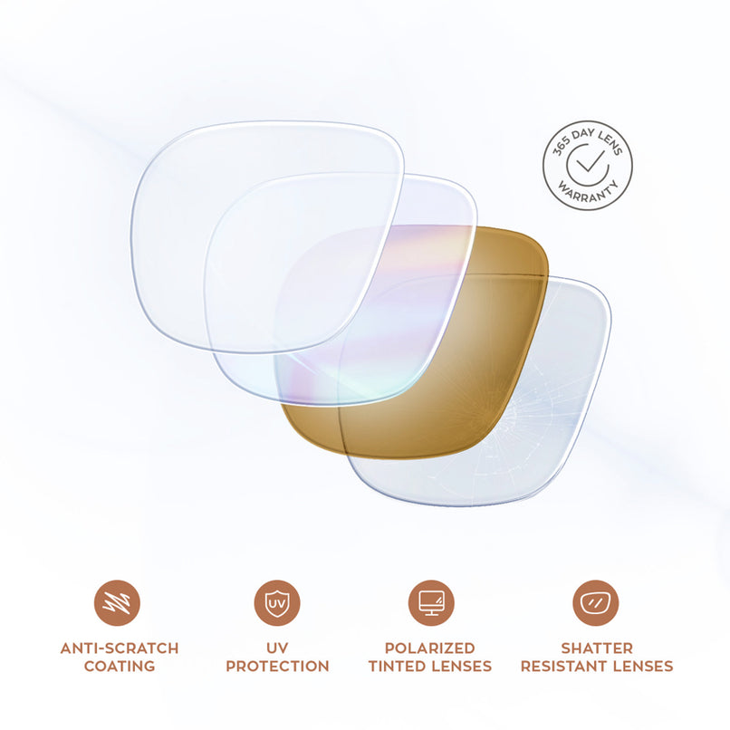 Add warmth to your style with our amber-tinted prescription sunglass lenses. These shatter-resistant lenses provide superior UV protection and polarization, giving you a fashionable look while enhancing your vision with clarity and comfort.